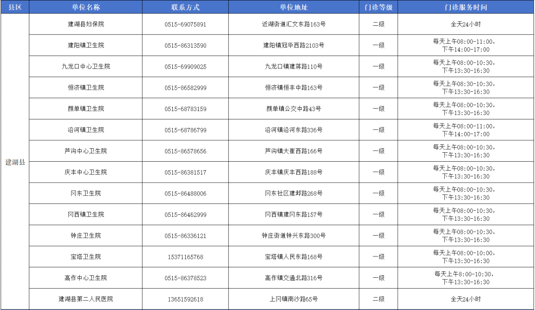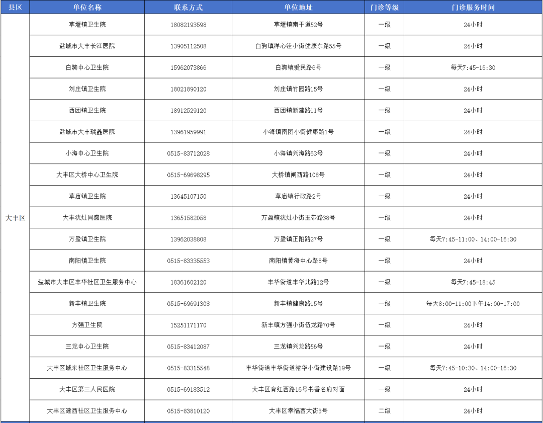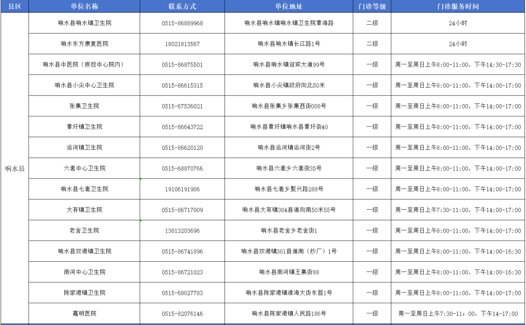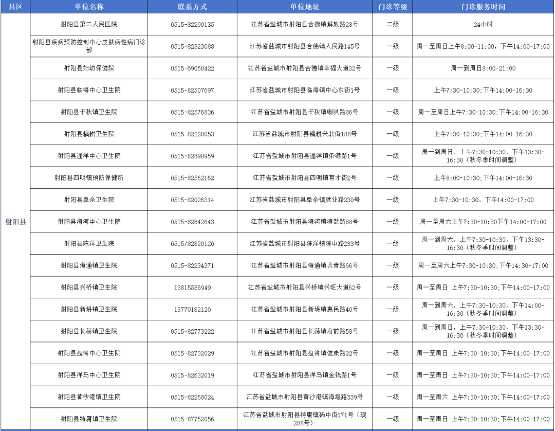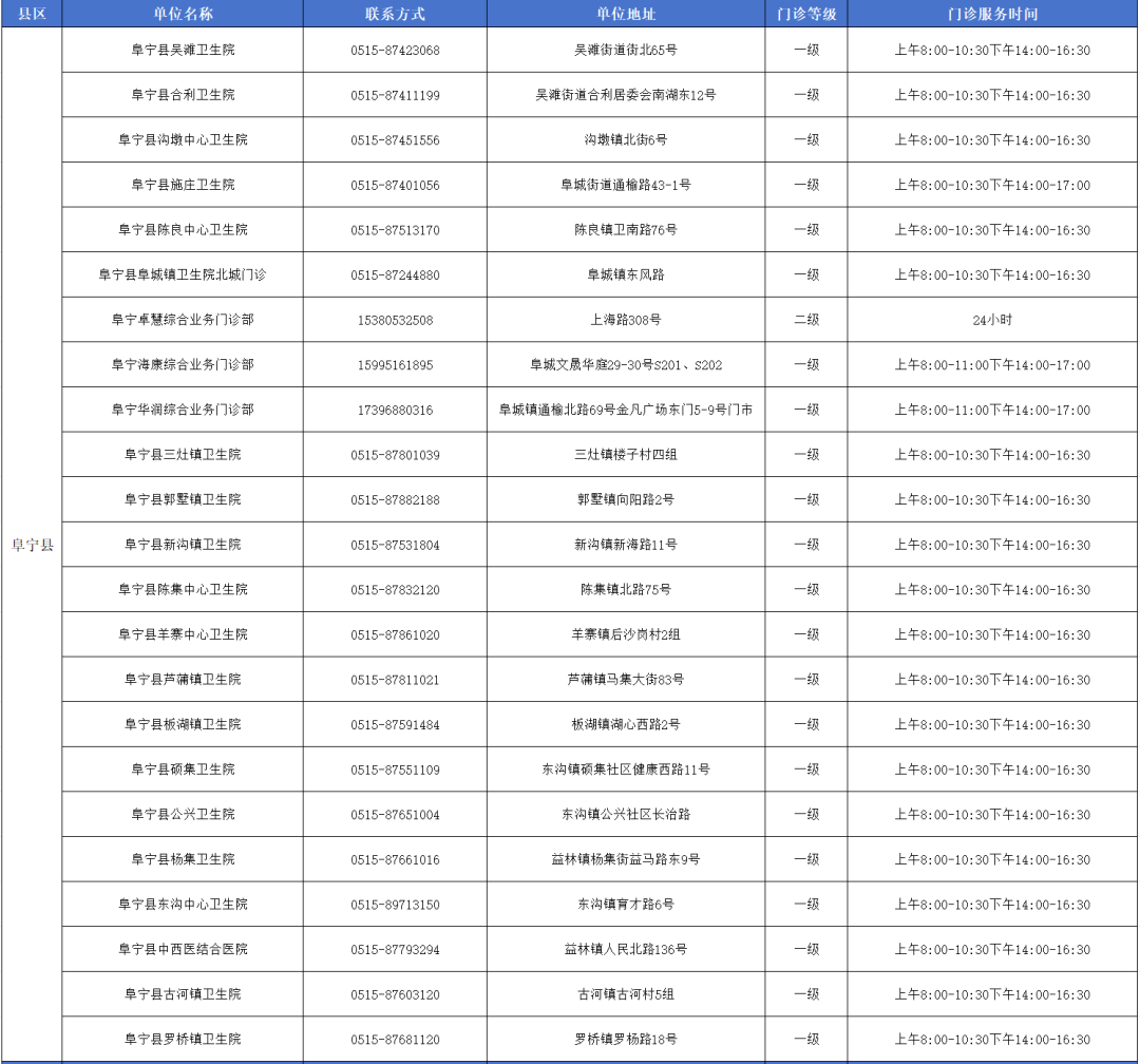 盐城市狂犬病暴露预防处置门诊信息一览表,其中滨海17家…