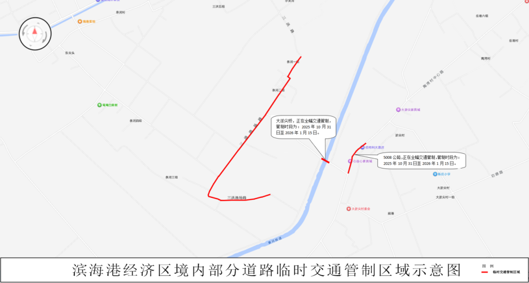 1.滨海港镇境内木洋路、兴庄路,全幅交通管制;