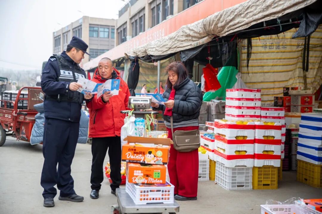 农批市场警务站,不仅是守护平安的治安岗亭,更是建在商户家门口的民生服务站。警务站将服务与防控深度融合,民辅警在日常巡逻中,主动为商户和群众讲解防火防盗知识、开展反诈宣传,用接地气、贴生活的方式提升群众安全防范意识;“冬瓜南瓜哈密瓜,别做被骗小傻瓜”,俏皮的反诈标语印在市场装货泡沫箱上,让平安知识随货物走向千家万户。