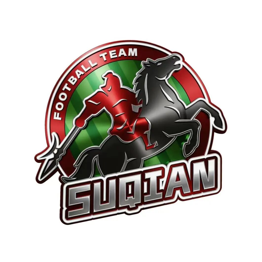 宿迁队队徽以“西楚霸王项羽”为魂,赤、黑二色为魄,将地域文化与足球精神深度融合,熔铸球队铁血军魂。主体为身披红甲的霸王骑乘乌骓马,手持长戟,姿态昂扬,既呼应宿迁“项王故里”的历史底蕴,又彰显球队勇往直前、锐不可当的精神气质。红甲与黑马搭配绿底条纹,既体现霸王勃发英姿,又体现球队驰骋绿茵的霸气与活力。外圈“FOOTBALL TEAM”与底部“SUQIAN”字样,清晰传递球队身份与地域归属,成为城市体育名片的鲜明符号。